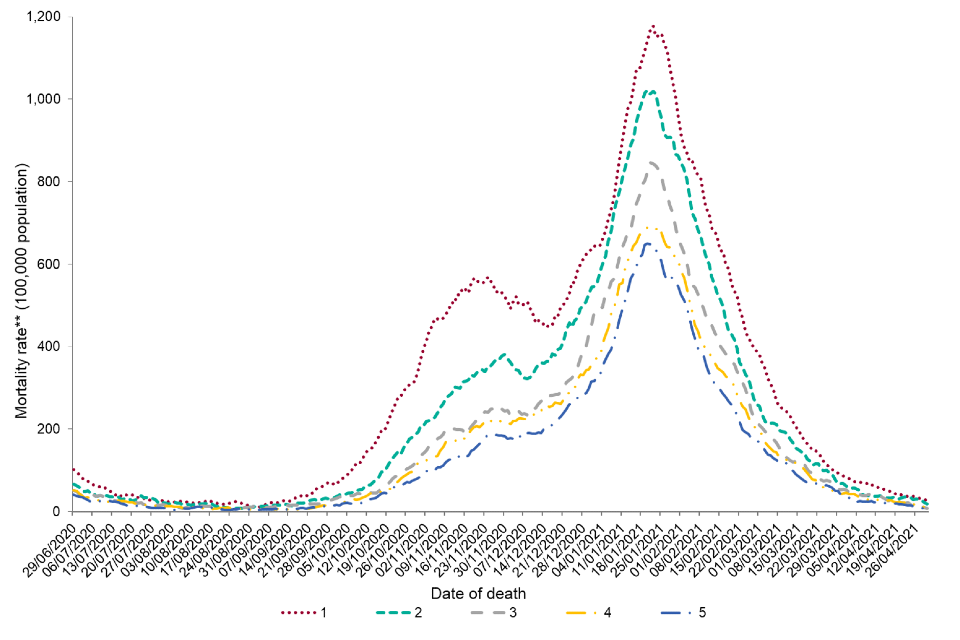Figure 4.b. Seven-day rolling average age-adjusted annualised mortality rate** (per 100,000) population in laboratory-confirmed cases of COVID-19 by IMD quintile, April 2021*†
