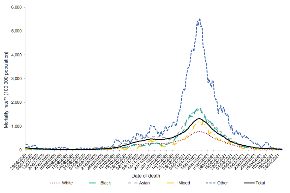 Overall, the age-adjusted annualised mortality rate from 29 June 2020 onwards was highest among those of Other ethnic groups (annualised rate of 875.3 per 100,000 population per year) followed by those of Asian or Asian British ethnic groups (annualised rate of 391.9 per 100,000 population per year). Although 87.2% deaths have been reported among those of White or White British ethnic groups, the age-adjusted mortality rate is lowest among this ethnic group (annualised rate of 188.0 per 100,000 population per year).