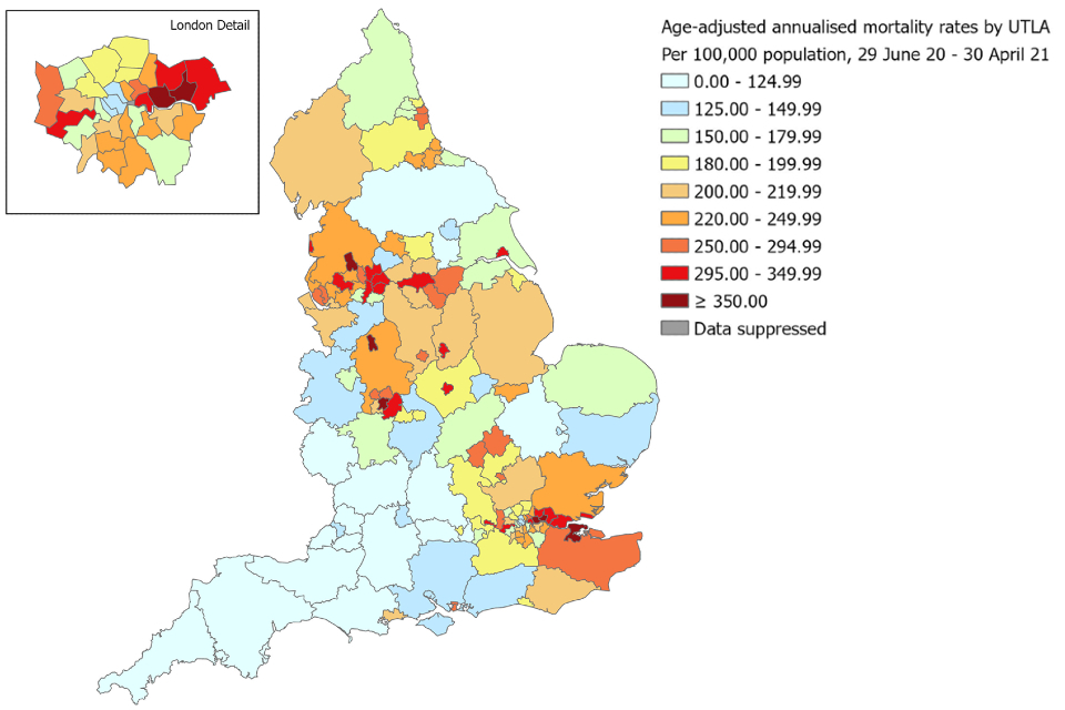 Mortality rates by region, local authority, sex, ethnic group and Index of Multiple Deprivation (IMD) have been age-standardised to account for the different age distributions within different populations.