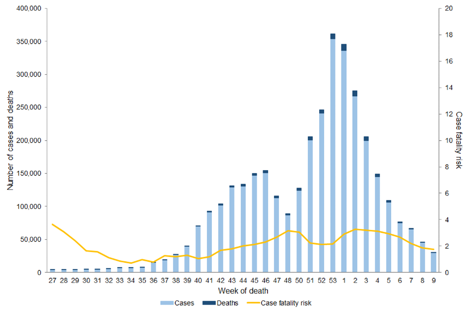 Note: The time period presented covers a period where testing coverage and testing modes have changed significantly, therefore apparent changes in estimated case fatality should be interpreted with caution. Numbers of cases and deaths are stacked by week. Cases are presented by week of specimen date. Deaths are presented by week of death.