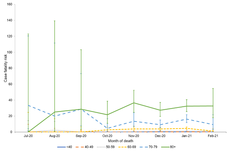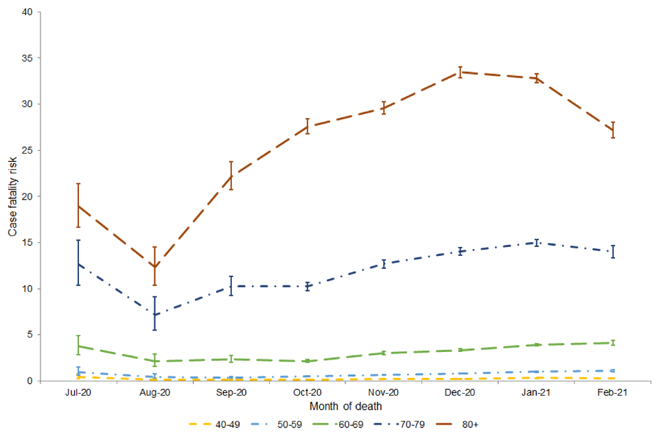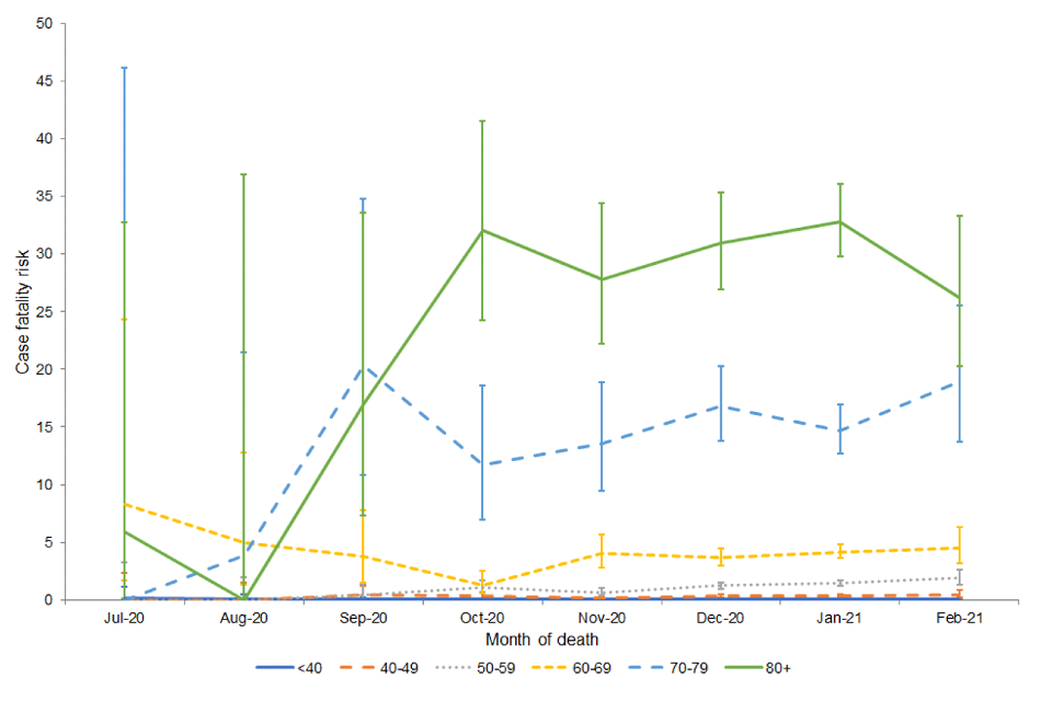 Since December 2020, the CFR has declined in the oldest age group (80+) and a decline has been seen in those aged 70 to 79 since January 2021. This is likely to reflect both the vaccination roll out and national lockdown, resulting in decreased pressure on healthcare services as cases decline.