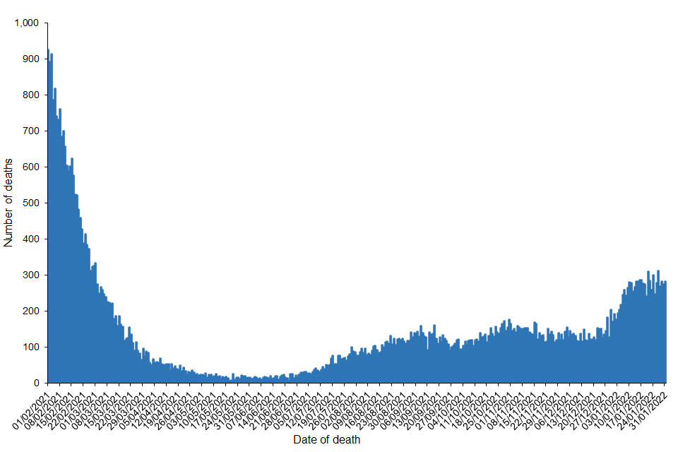 Figure 1. Number of deaths in cases of COVID-19 by date of death, from 1 February 2021 to 31 January 2022*†