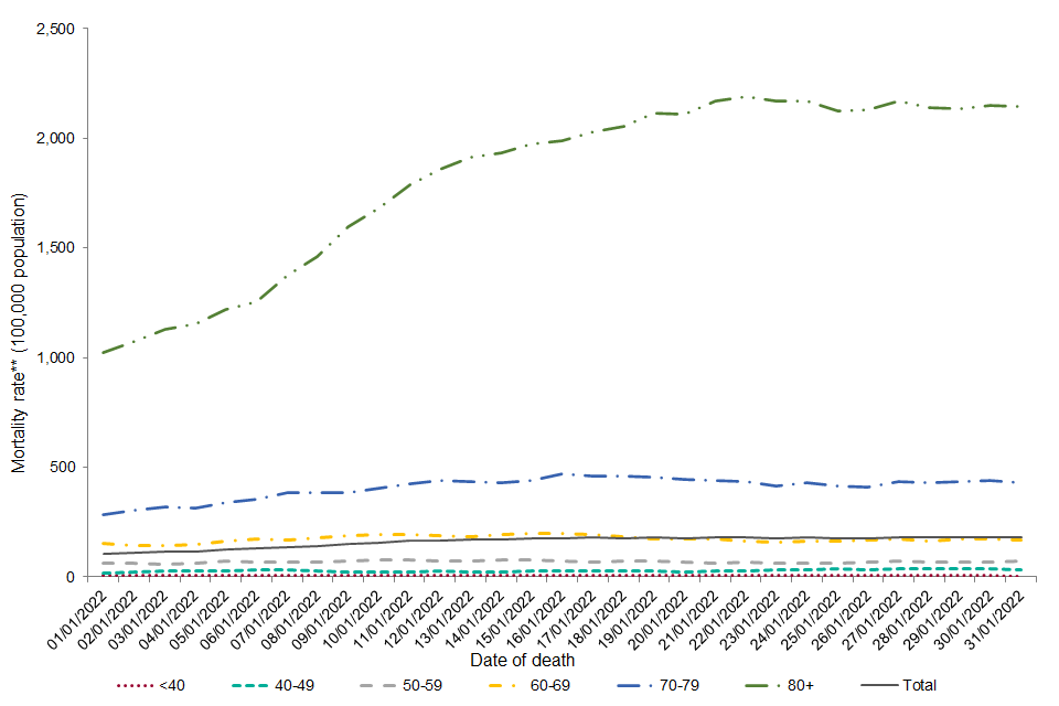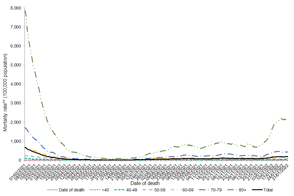 Since 1 February 2021, the mortality rate was highest among those aged over 80 (annualised rate of 971 per 100,000 population per year).