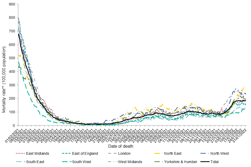 Since 1 February 2021, the annualised mortality rate was highest in the North West (120.7 per 100,000 population per year), followed by the West Midlands (111.8 per 100,000 population).