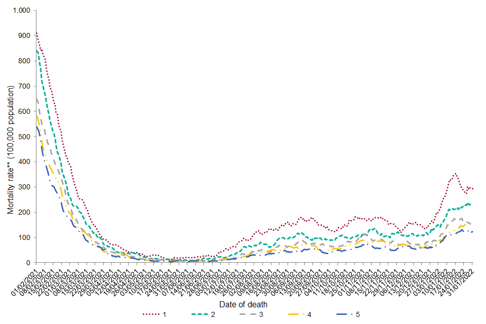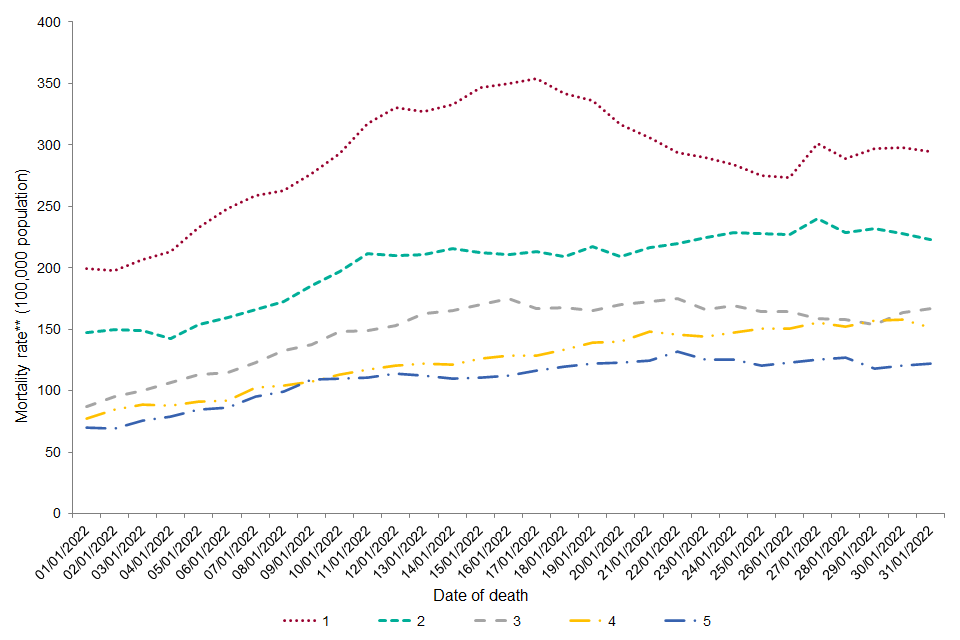 In January 2022, the age-adjusted annualised mortality rate was highest among those living in areas of IMD quintile 1, and the lowest mortality rate was seen among those in the least deprived quintile, quintile 5.