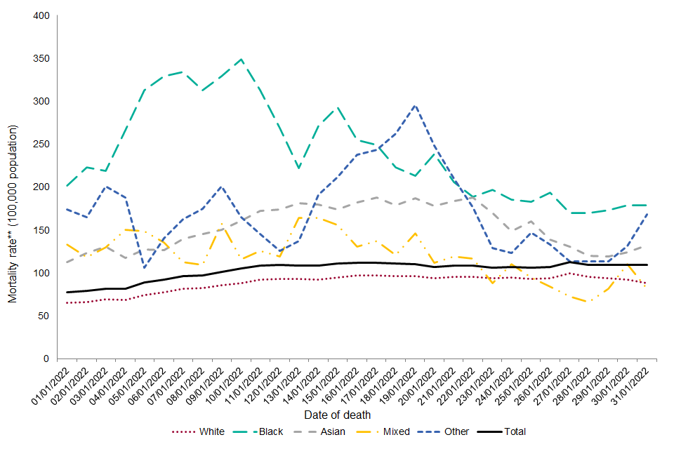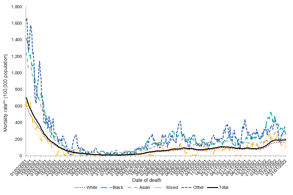 Overall, the age-adjusted annualised mortality rate from 1 February 2021 onwards was highest among those of Other ethnic groups (annualised rate of 232.5 per 100,000 population per year) followed by those of Black and Black British ethnic groups (annualised rate of 210.9 per 100,000 population per year).