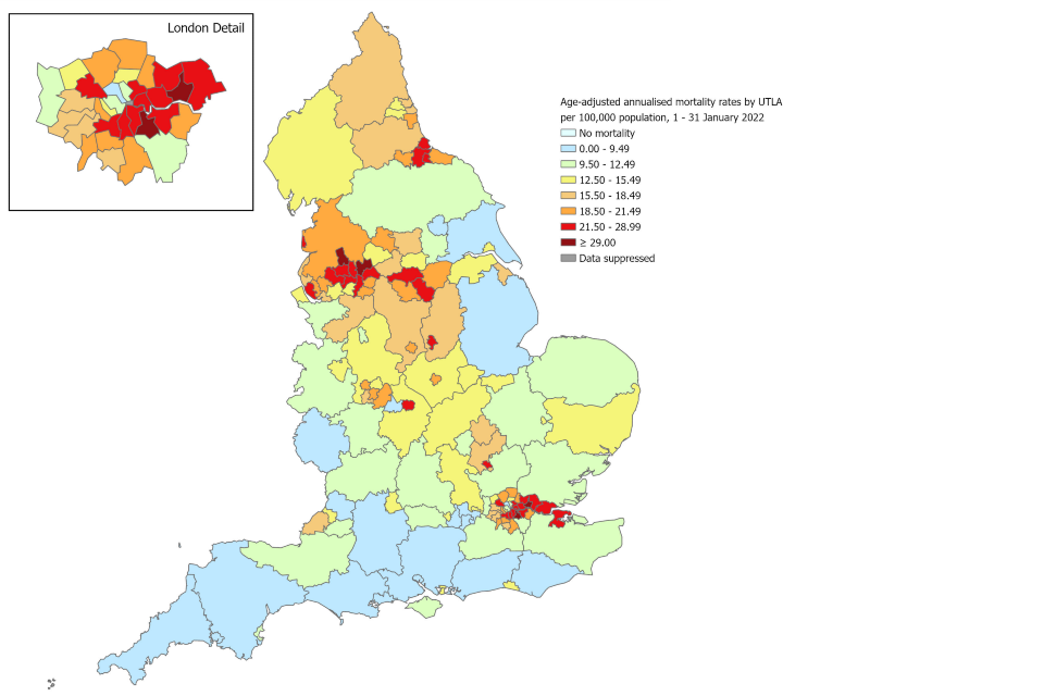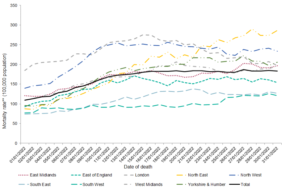 The lowest mortality rate was seen in the South West (62.5 per 100,000 population per year). In January 2022, the highest annualised mortality rate was seen in London (19.8 per 100,000 population per year).
