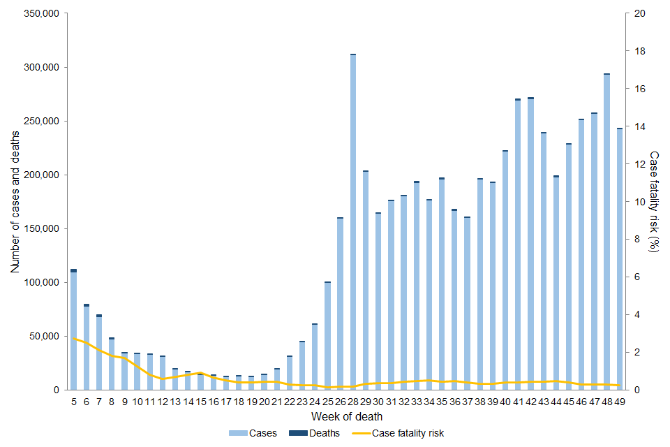 Figure 7. Number of cases, deaths and case fatality risk in cases of COVID-19, 1 February 2021 to 10 December 2021*†