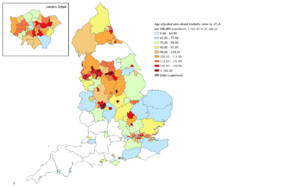 Mortality rates by region, local authority, sex, ethnic group, and Index of Multiple Deprivation (IMD) have been age-standardised to account for the different age distributions within different populations.