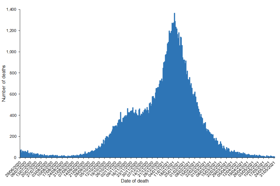 Within the period 29 June 2020 to 31 May 2021, 3,678,324 cases of COVID-19 were detected in England. In the same period, there have been 91,486 deaths in persons with laboratory-confirmed COVID-19. This represents a crude mortality rate of 162.5 per 100,000 population. From 29 June 2020 onwards, the highest recorded number of daily deaths was 1,504 deaths on 19 January 2021.