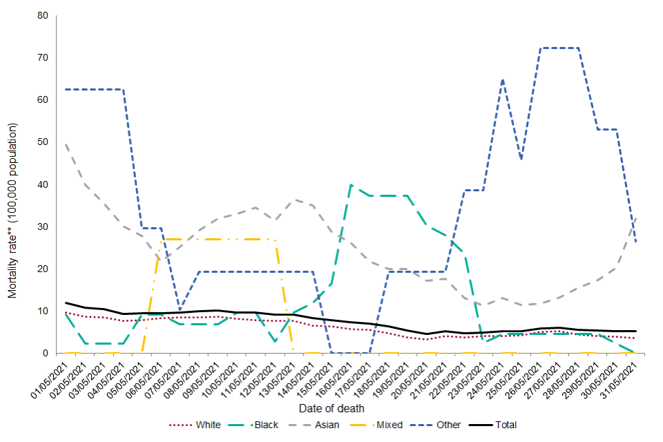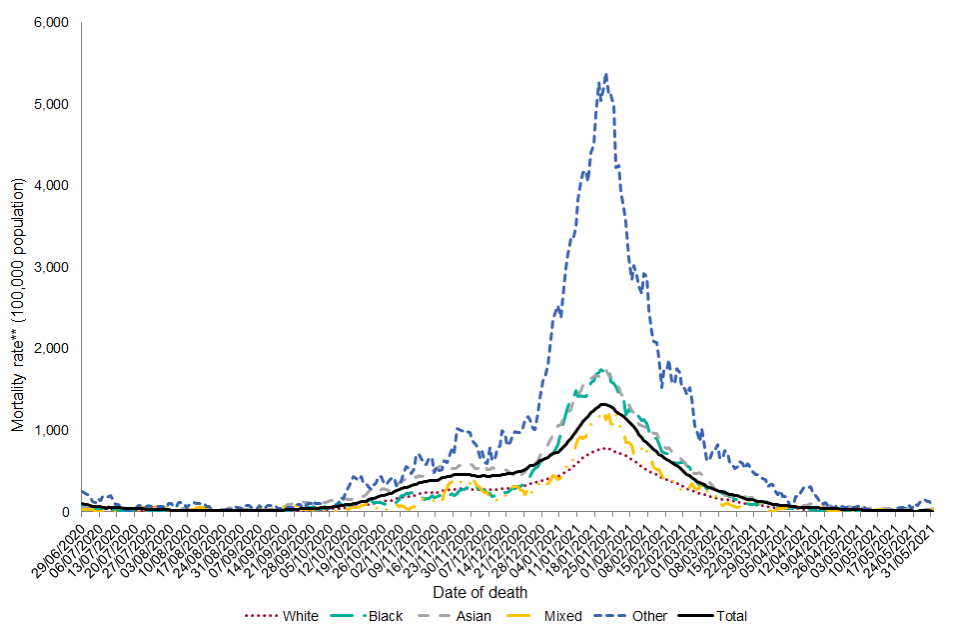 Overall, the age-adjusted annualised mortality rate from 29 June 2020 onwards was highest among those of Other ethnic groups (annualised rate of 794.3 per 100,000 population per year) followed by those of Asian or Asian British ethnic groups (annualised rate of 358.5 per 100,000 population per year). Although 88.6% deaths have been reported among those of White or White British ethnic groups, the age-adjusted mortality rate is lowest among this ethnic group (annualised rate of 171.7 per 100,000 population per year).