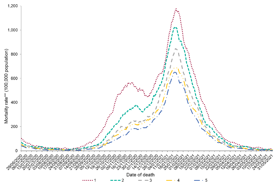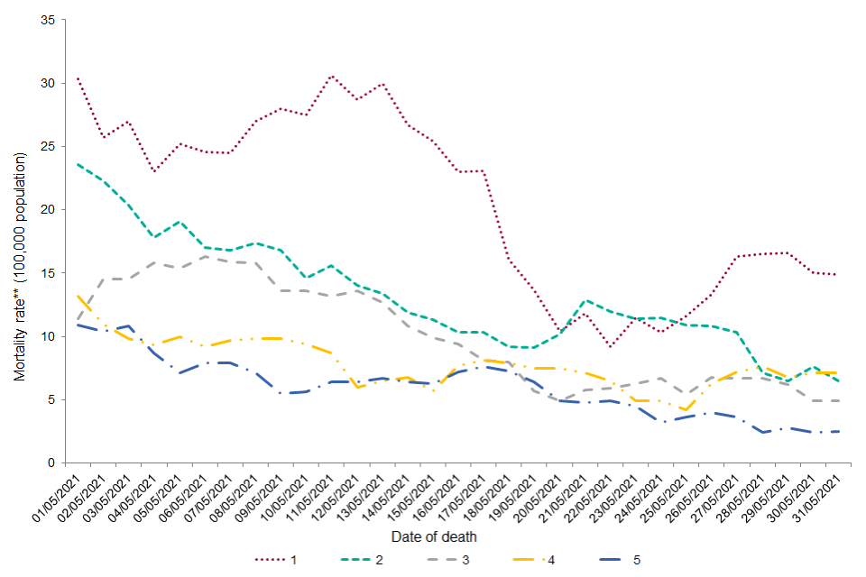 Figure 4.b. Seven-day rolling average age-adjusted annualised mortality rate** (per 100,000) population in laboratory-confirmed cases of COVID-19 by IMD quintile, May 2021*†