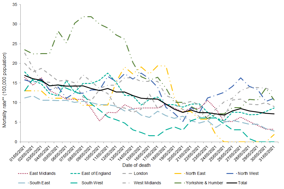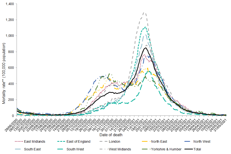 Since 29 June 2020, the annualised mortality rate was highest in the North West (219.1per 100,000 population per year), followed by London (207.0 per 100,000 population per year) and the West Midlands (203.4 per 100,000 population per year). The lowest mortality rate was seen in the South West (95.3 per 100,000 population per year). In May, the highest annualised mortality rate was seen in Yorkshire and Humber (1.6 per 100,000 population per year).