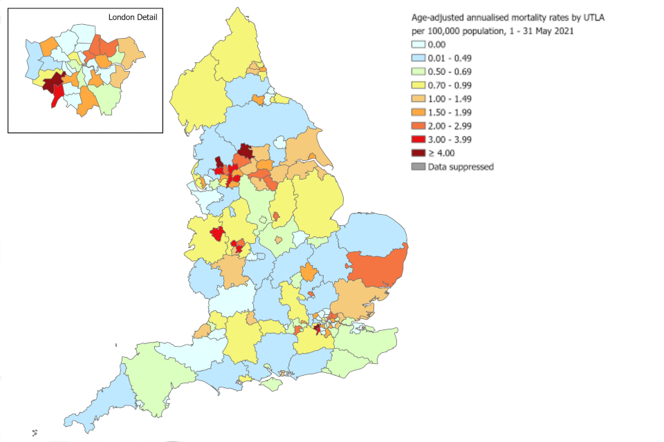 Figure 6.b. Age-adjusted annualised mortality rates** (per 100,000 population) in laboratory-confirmed cases of COVID-19, by upper-tier local authority, May 2021*†