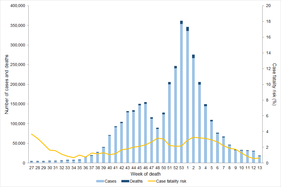 Note: The time period presented covers a period where testing coverage and testing modes have changed significantly, therefore apparent changes in estimated case fatality should be interpreted with caution. Numbers of cases and deaths are stacked by week. Cases are presented by week of specimen date. Deaths are presented by week of death.