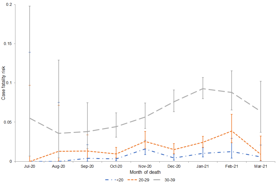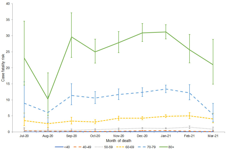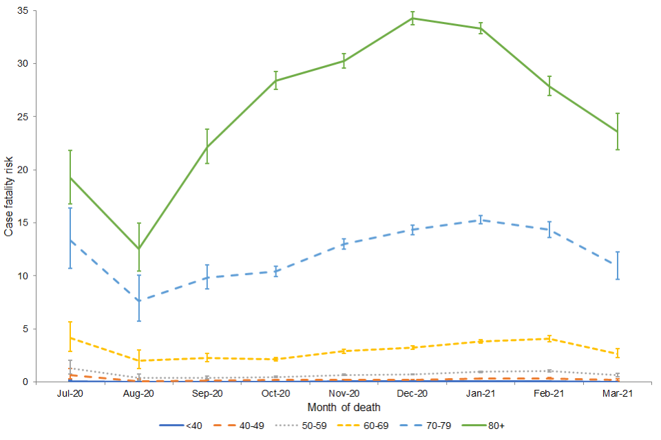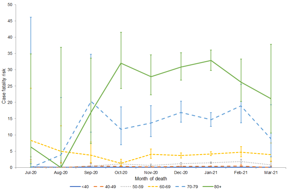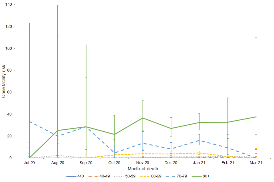 Since December 2020, the CFR has declined in the oldest age group (80+). A decline has been seen in those aged 70 to 79 since January 2021 and those aged 60 to 69 since February 2021. This is likely to reflect delivery of the COVID-19 vaccination programme and national lockdown, resulting in decreased pressure on healthcare services as cases decline.