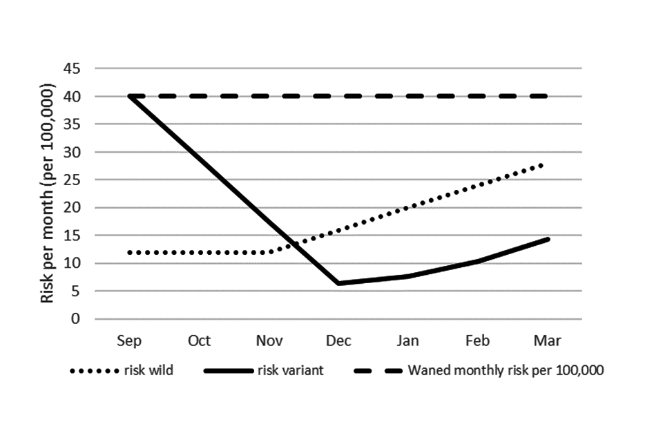 - The waned vaccine effectiveness (VE) of 3 doses and increase in effectiveness from using a wild type and a variant vaccine. This can be estimated from data on the waned VE of dose 3 and an assumption that a further dose would restore effectiveness to the post dose 3 level (reference 2). For the variant vaccine, to estimate increase in VE, the fold difference in neutralising titres for this vaccine compared to wild type (taken to be about 2) (references 3 and 4) is used and the increase estimated based on the paper of Cromer and others (reference 5).