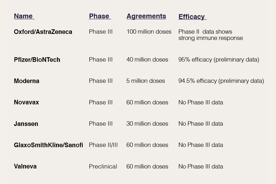 22. The government is supporting efforts to research and produce an effective, safe and widely available vaccine as early as possible. The government has announced agreements with seven separate vaccine developers. In total, the government has secured access to over 350 million doses between now and the end of 2021. The table below outlines the progress of the different vaccines for which the government has agreements. The government will make vaccines available for all of the UK, plus the Crown Dependencies and Overseas Territories.