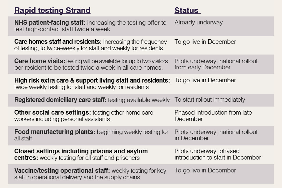 40. To date, testing has focused on symptomatic testing, testing in areas with outbreaks and protecting those most at risk, for example in care homes. Those efforts will continue but the use of testing is now being broadened to identify those showing no symptoms who can infect people unknowingly. The government plans to introduce frequent testing as an alternative to the need for self-isolation for people who have had close contact with someone who has COVID-19. Instead, contacts will be offered regular tests as an alternative to isolation and only have to self-isolate if they test positive. This will be trialled in Liverpool first, then some institutional settings (e.g. the NHS, care homes, education, employers) before the end of the year, ahead of rollout across the country from early next year.