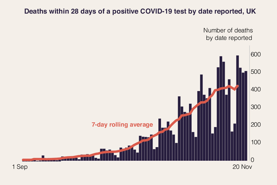 Data for Scotland and Wales up to 19 November. Data for Northern Ireland up to 18 November. See statistical notes for more information. Source: https://coronavirus.data.gov.uk/.