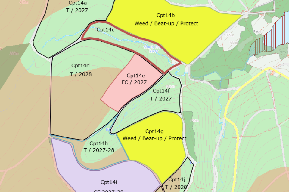 Do not include other felling operations or constraints on the same map because it makes boundaries hard to read. Instead, highlight these on separate operations and constraints maps respectively.
