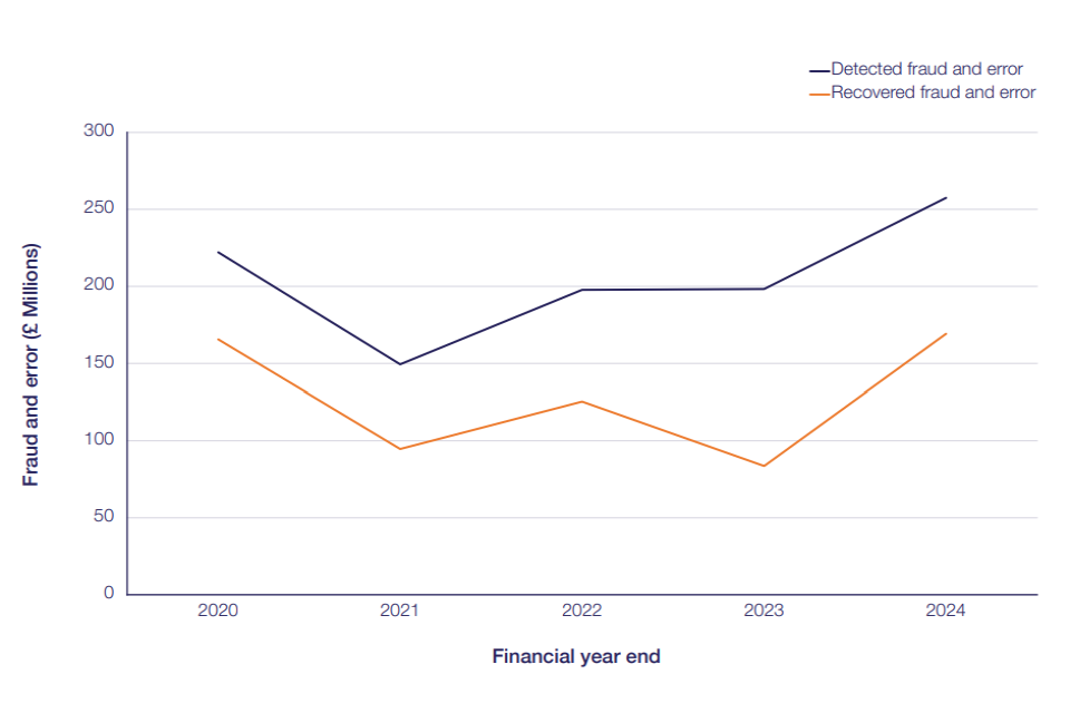 The chart below shows how much fraud and error has been detected and recovered by government departments since 2019/20.[footnote 1]