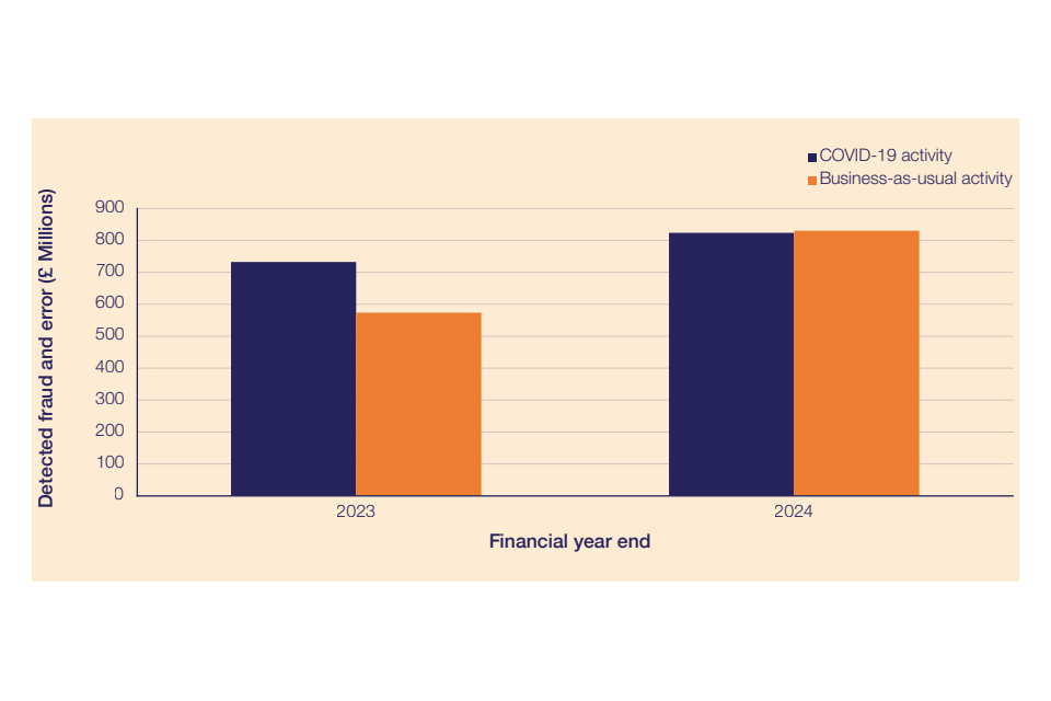 - Detected fraud and error relating to business-as-usual activity increased by £257m (45%) and in COVID-19 activity by £91m (12%).