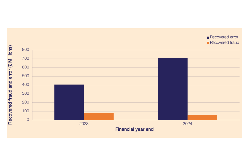 - Recovered fraud decreased by £20m (25%), while recovered error increased by £304m (75%).