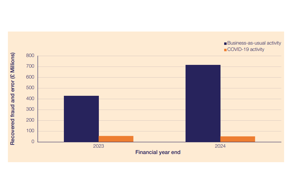 Recovered fraud and error in COVID-19 activity accounted for £53m (7%) of total recoveries in 2023/24 and decreased by £4m (6%) compared to 2022/23.