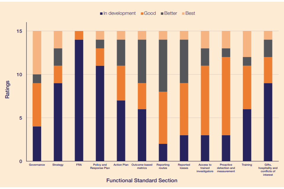 - Encouraging results are beginning to emerge from the preventative approach championed by the Government Counter Fraud Functional Strategy 2024-2027. 60% of organisations reviewed against the Government Functional Standard (GovS 013: Counter Fraud) attained a minimum rating of ‘Good’ in at least half of the sections in the standard. Public bodies may benefit from going further in two critical areas: identifying inherent fraud and error vulnerabilities and implementing more robust fraud risk assessments to address threats effectively.