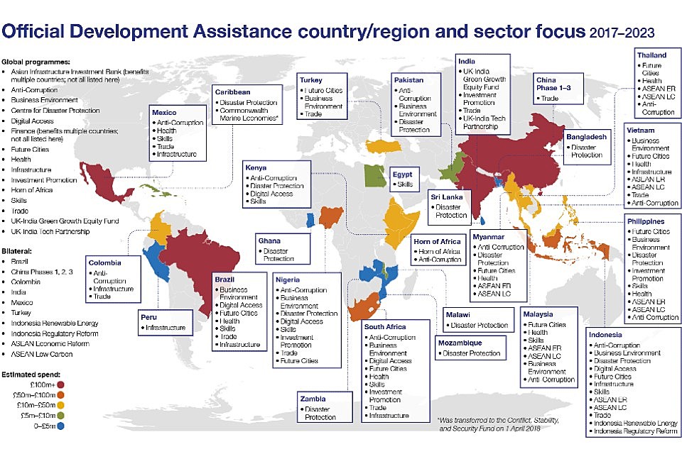 Map showing Official Development Assistance by country or region and sector focus, 2017-2023