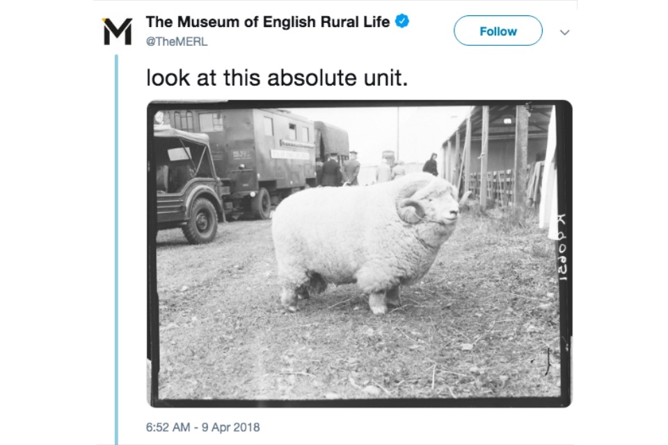 In April 2018, the Museum of English Rural Life (The MERL) transformed its profile and global reach through the success of a single tweet – an archival photograph of an Exmoor Horn aged ram, captioned ‘look at this absolute unit’. The resulting campaign has seen it become one of the world’s most successful museums on Twitter.