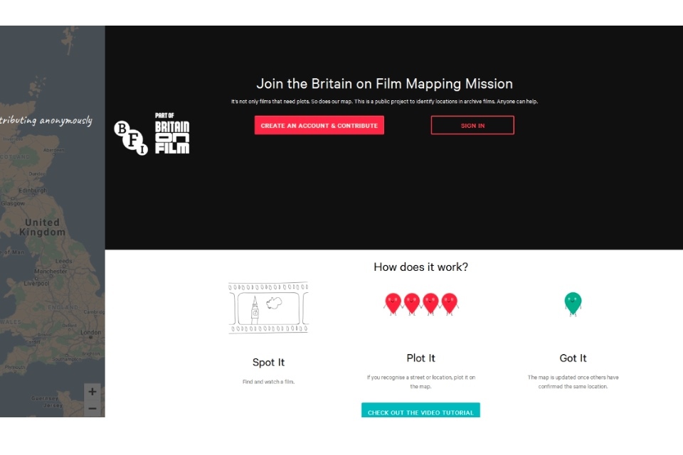 Screenshot of the BFI landing page asking people to 'Join the Britain on Film Mapping Mission'