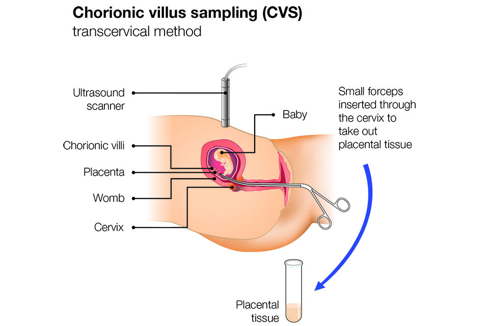The hospital will send the sample of tissue from your placenta (CVS) or amniotic fluid (amniocentesis) to a laboratory for testing.