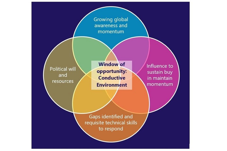 4 overlapping circles for: growing global awareness and momentum, influence to sustain buy in maintain momentum, gaps identified and requisite technical skills to respond, political will and resources