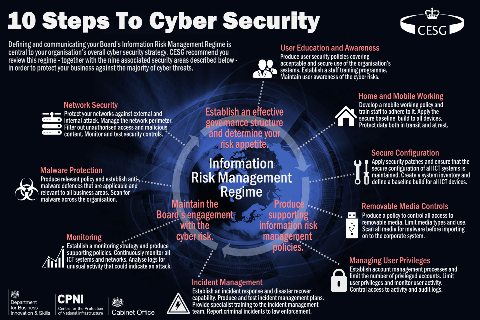 This guidance is for businesses looking to protect themselves in cyberspace. The 10 Cyber Security Steps - originally published in 2012 and now used by around two thirds of the FTSE350 - remain the same and are outlined below. But alongside this second version of the 10 Steps we are also publishing a new paper, “Common Cyber Attacks: Reducing The Impact”. The paper sets out what a common cyber attack looks like and how attackers typically execute them. We believe understanding the cyber environment and adopting the 10 Steps are effective means in protecting your organisation from these attacks.