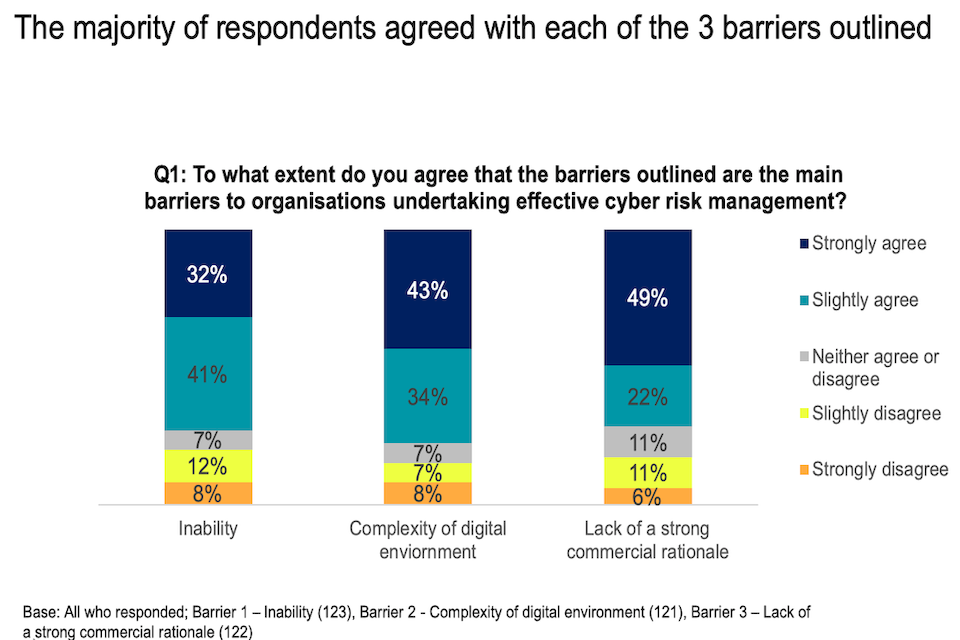 To what extent do you agree that the barriers outlined ((1) inability; (2) complexity and insecurity of the digital environment; and (3) lack of a strong commercial rationale) are the main barriers to organisations undertaking effective cyber risk management? Single response (Strongly agree, slightly agree, neither agree or disagree, slightly disagree, strongly disagree)