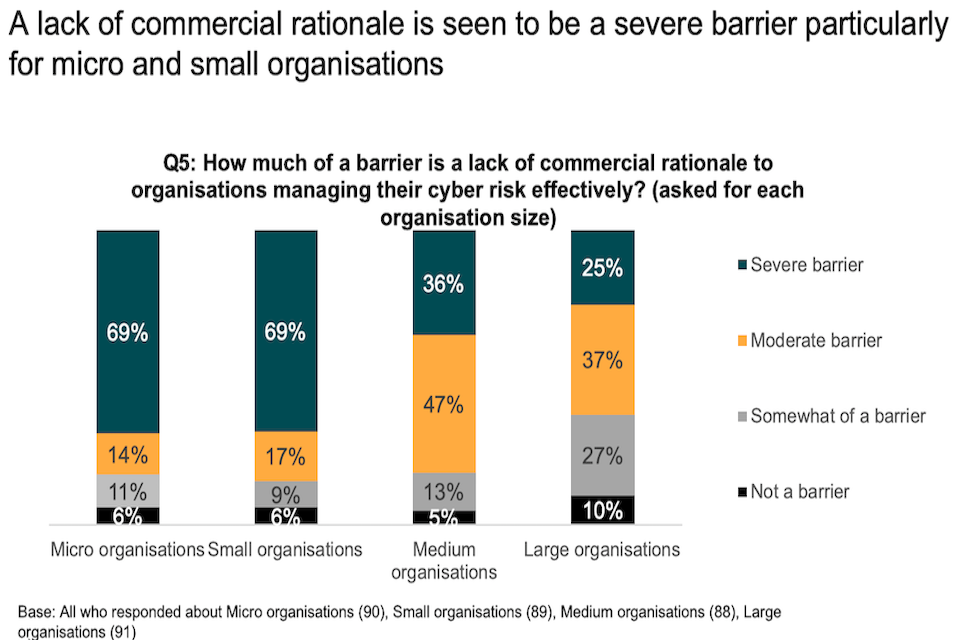 - Lack of commercial rationale, including that organisations find it difficult to demonstrate compelling cases for return on investment on cyber security due to the lack of quantifiable information, including the financial impact, related to cyber attacks.