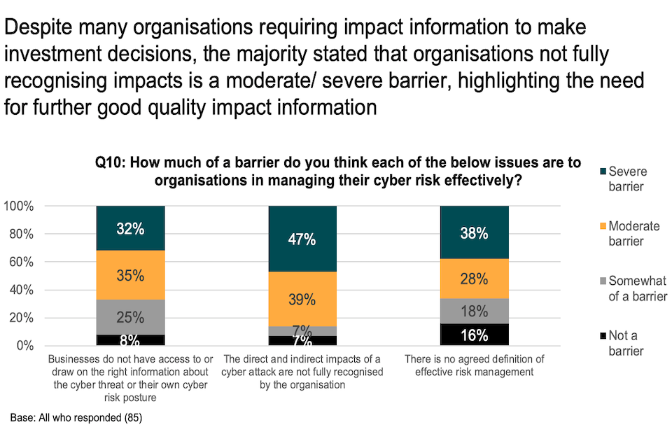 - The direct and indirect impacts of a cyber attack with 86% of respondents stating the inability to fully understand the impact of cyber attacks is a moderate or severe barrier to effective risk management.