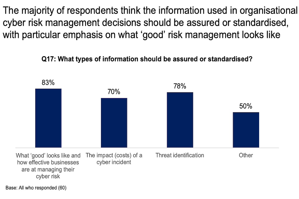 Respondents were asked to provide evidence of the solutions organisations currently have for assuring and standardising information used in cyber risk management; whether additional solutions are required; what types of information should be assured or standardised and how Government or industry could help to generate more useful information. Respondents were also asked what is required to improve responsibility and accountability at a senior level within organisations.