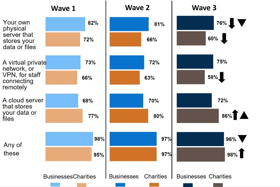 Almost all businesses (96%) and charities (98%) have a cloud or physical server to store data. Although, compared to previous waves of this study, this proportion has remained stable, the underlying trends have shifted. Increasingly, physical servers are less likely to be used by businesses (76% in Wave Three compared to 81% in Wave Two and 82% in Wave One) and charities (60% in Wave Three compared to 72% in Wave One).