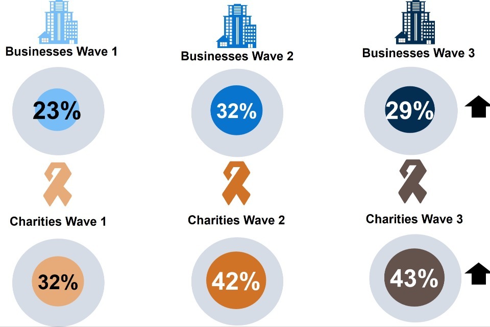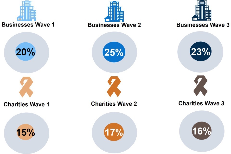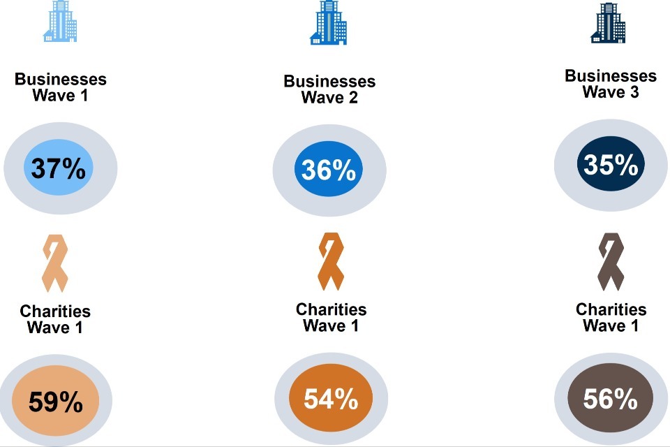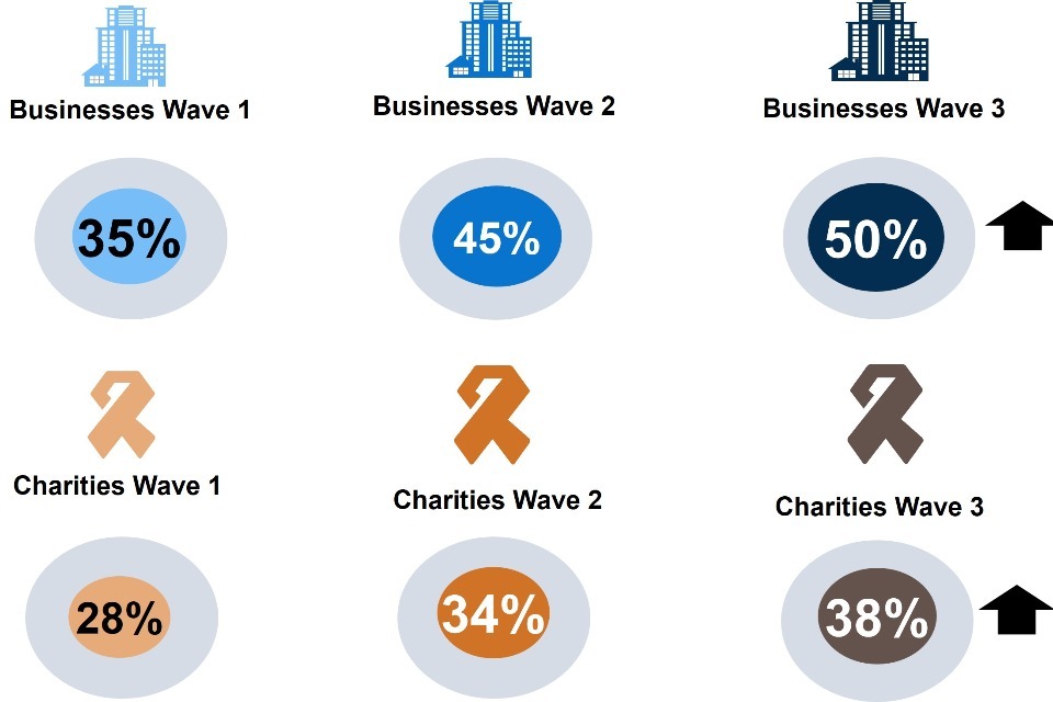 If organisations had been confirmed as eligible and included when first interviewed in Wave One or Wave Two, but now have fewer than 50 employees (businesses) or an income below £1 million (charities), they are still considered eligible to participate in this wave. ↩