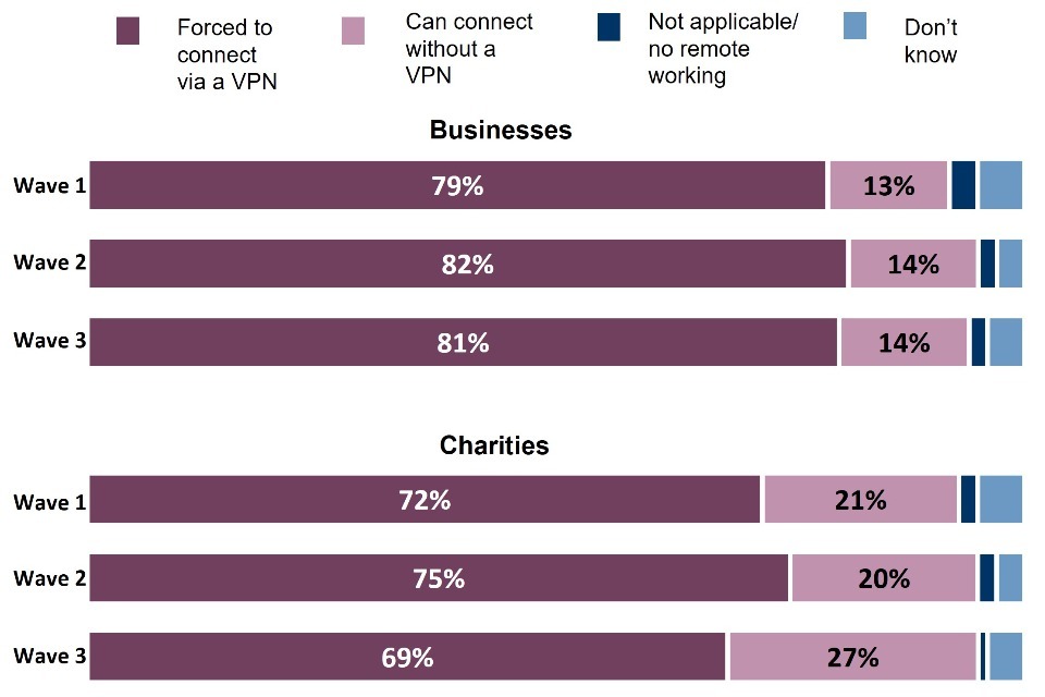 - VPN usage among organisations remains very high (81% of businesses and 69% of charities force employees to connect via a VPN).