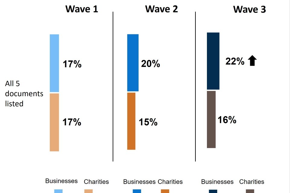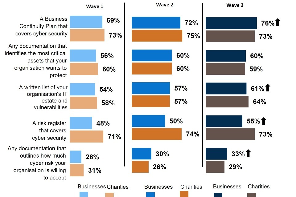The document that is least prevalent among organisations is a document outlining how much cyber risk organisations are willing to accept (33% among businesses, an increase compared to 26% at Wave One, and 29% among charities which is comparable to previous waves). Again, this indicates that organisations are not necessarily forward thinking in their planning for cyber security.