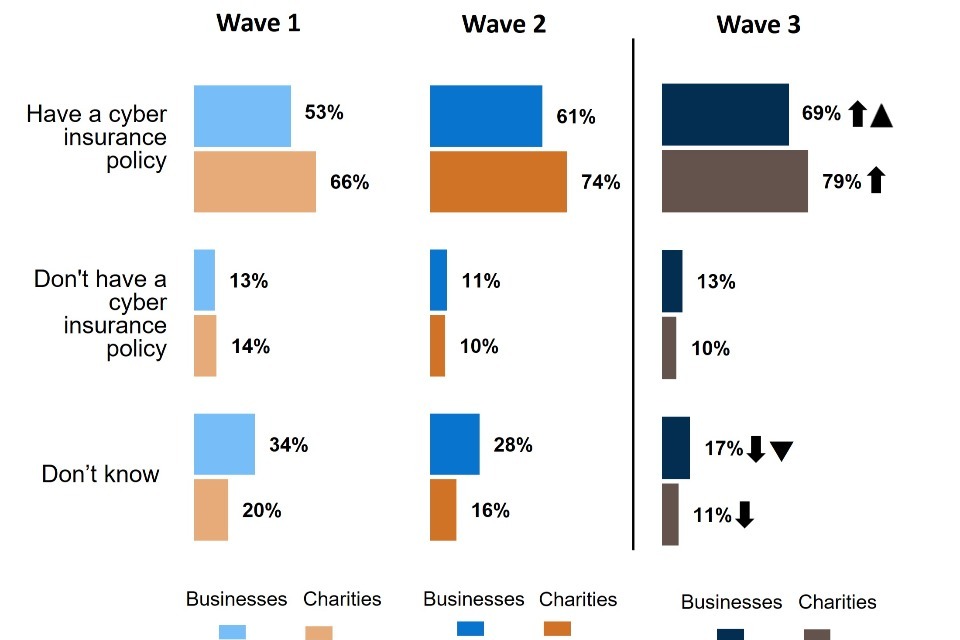 - There has been a shift between Wave One (53% of businesses, 66% of charities) and Wave Three (69% of businesses, 79% of charities) in the proportion of organisations that have a cyber insurance policy. This reflects higher proportions among both cyber-specific insurance policies and broader policies that covers cyber security risk.