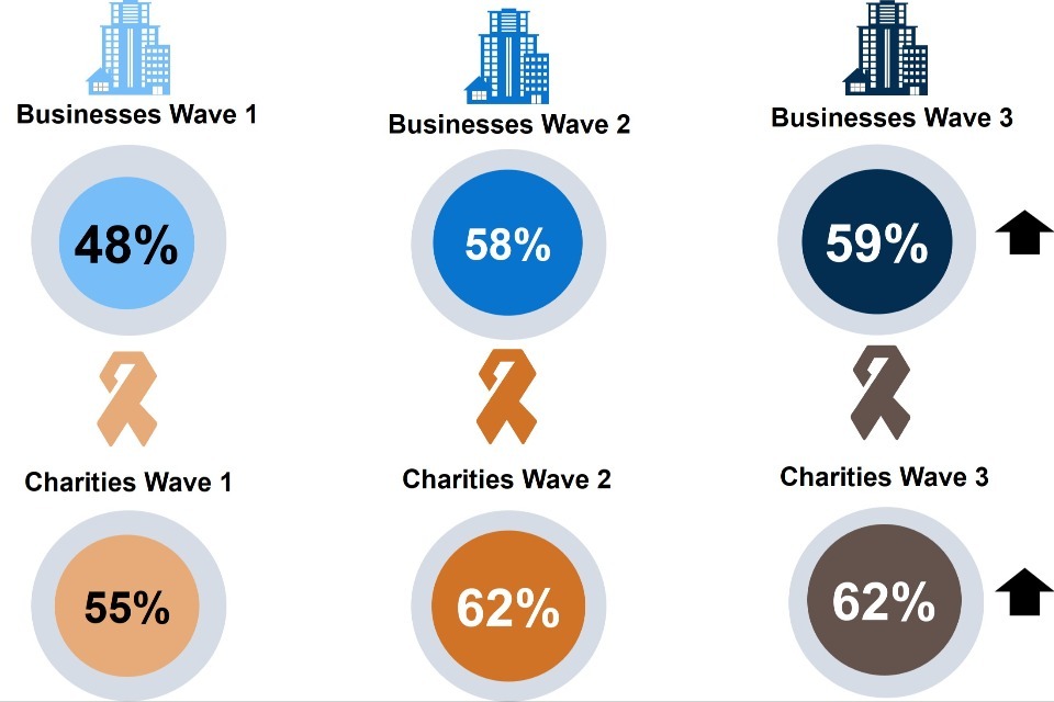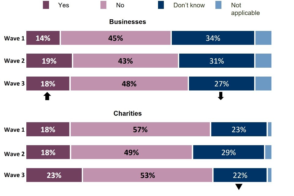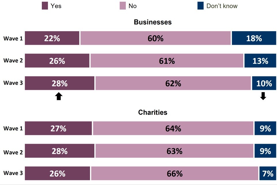 The findings from Wave Three are largely consistent with Wave Two and as such there have only been sporadic improvements between the two waves. However, there have been some improvements between Wave One and Wave Three, particularly among businesses. These include: