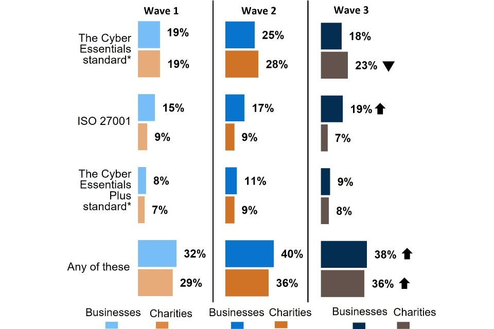 Compared to Wave One, adherence to Cyber Essentials has increased among charities (23% in Wave Three vs. 19% in Wave One) but remains consistent for businesses across all three waves. Whilst it has not shown a significant improvement between Wave One (15%) and Wave Three (19%), findings from the qualitative interviews suggest the ISO 27001 certification is considered by businesses to be the most robust and substantive accreditation available.