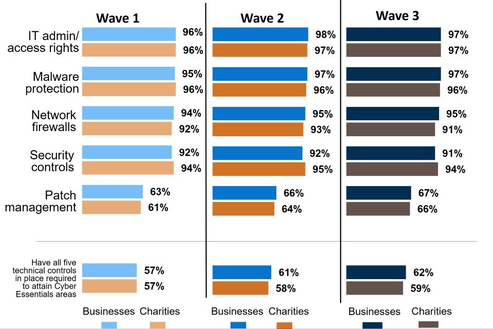 - Among both businesses and charities, around six in ten (62% of businesses, 59% of charities) have in place all the necessary technical controls required to attain Cyber Essentials. Almost all businesses and charities have the following in place: IT access rights, malware protection, network firewalls and security controls. However, patch management is the least common (67% among businesses, 66% among charities).