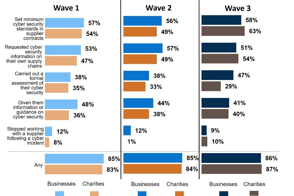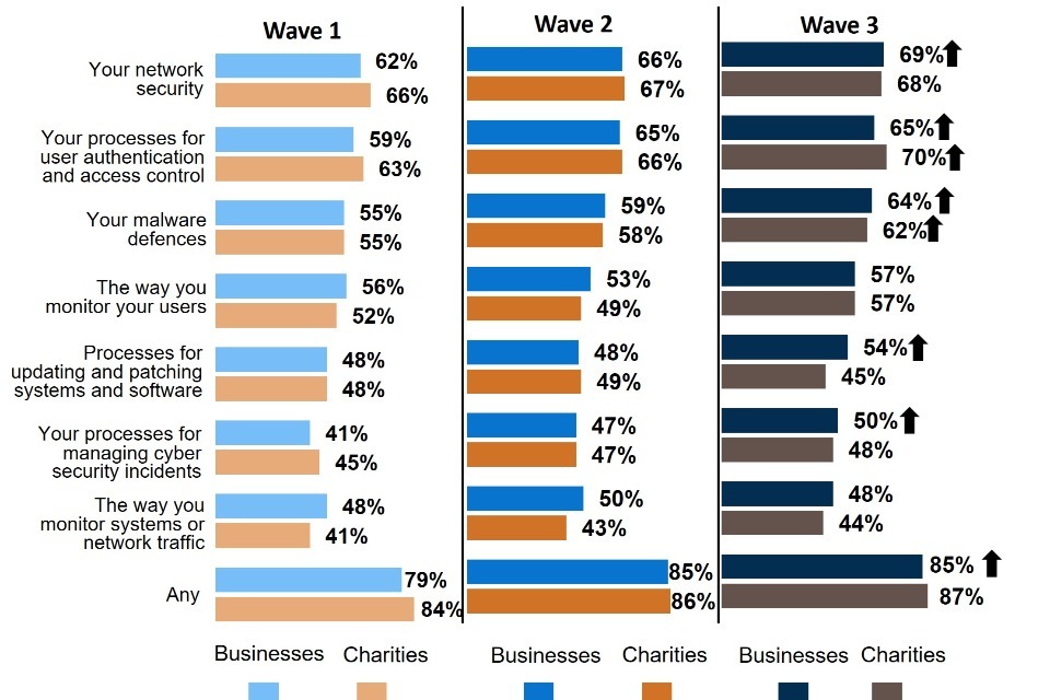 This trend is particularly pronounced among charities, where the stability across all three waves is most marked. By contrast, businesses show more improvements compared to Wave One, but again remain stable between Waves Two and Three. This reflects the general trend for businesses to often have a more advanced approach to cyber security than charities.