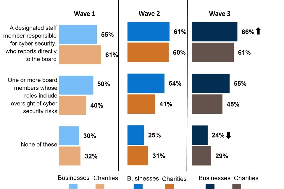 In Wave Three, approximately half of organisations (55% of businesses, 45% of charities) have a member on their board responsible for oversight of cyber security. More organisations (66% of businesses, 61% of charities) have a staff member that is responsible for cyber security that reports to the board. Among businesses this is an increase on Wave One (55%) but is comparable to Wave Two (61%).